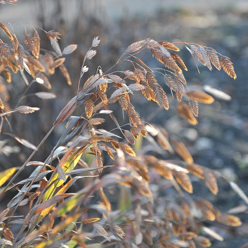 Chasmanthium latifolium ‘Little Tickler’ (Dwarf Northern Sea Oats) is a clumping, upright dwarf grass. The flower spikes also make nice cut or dried flowers for wreaths and arrangements. Plant it as an accent, along a border, or let it naturalize in woodland gardens. Nice in containers too. Native to North America, Chasmanthium latifolium is found in the eastern US from Pennsylvania to Florida and west to Wisconsin and Texas. Easy to grow, this native cultivar is drought tolerant once established and is salt tolerant for roadside and coastal areas.